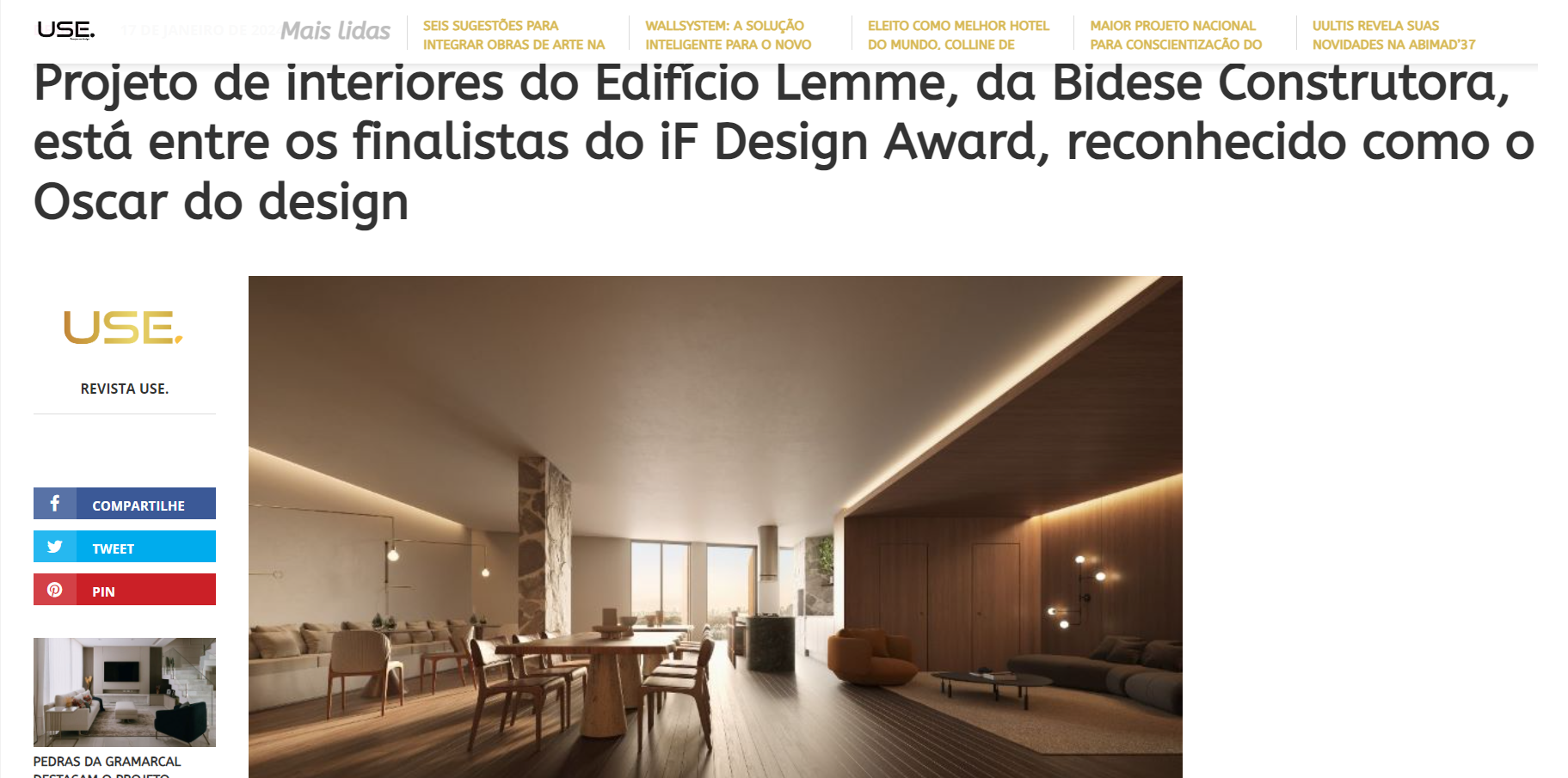 Confira a matéria completa em: https://revistause.com.br/projeto-de-interiores-do-edificio-lemme-da-bidese-construtora-esta-entre-os-finalistas-do-if-design-award-reconhecido-como-o-oscar-do-design/