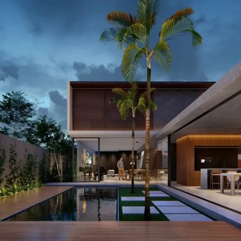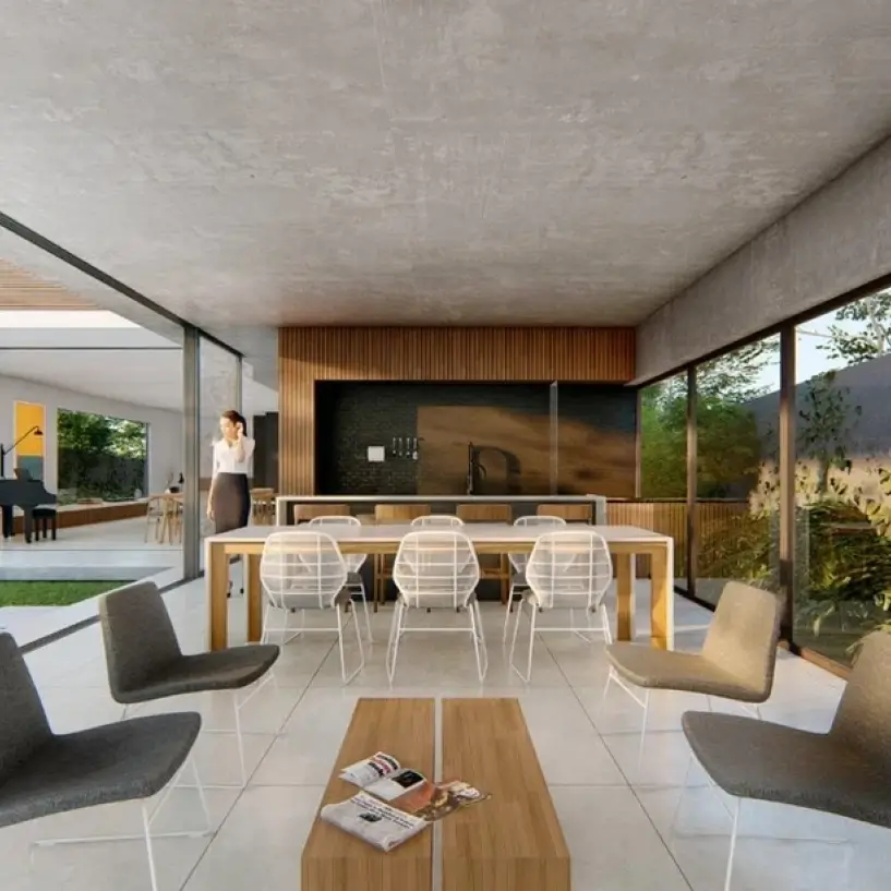 A casa TCN possui um ambiente de estar bem amplo, com esquadrias de piso ao teto. Na parte externa, a integração entre espaço gourmet e piscina, proporciona aos moradores uma ótima funcionalidade.